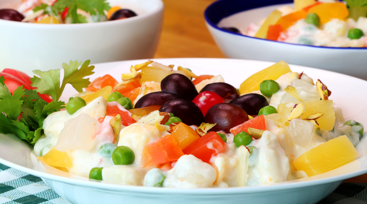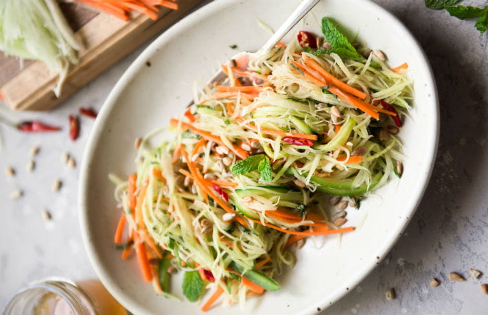 " A fresh, healthy and absolutely delicious salad recipe. Packed with the goodness of carrots, green papaya and cucumbers, this dish of salad is curated in the colours of India's national flag. The sweet and sour honey-soy dressing is the perfect addition to the salad."